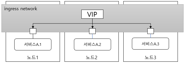 각 노드는 외부에 개시된 서비스 포트로 요청이 오면 ingress 네트워크의 가상 IP로 전달한다. 가상 IP는 ingress 네트워크에서 서비스에 접근할 때 사용할 IP이다. 가상 IP에 전달된 요청은 다시 컨테이너의 IP로 전달된다. ingress 네트워크에 참여한 서비스의 각 컨테이너는 ingress 네트워크 내에서 고유 IP를 갖는다.