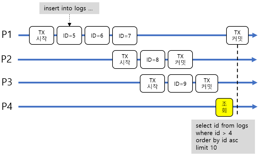 logs 테이블의 id 칼럼이 자동 증가 칼럼이라고 하자. 최근 id 칼럼 값이 4라고 할때 이 칼럼에 P1, P2, P3과 아래 그림과 같은 순서로 insert 쿼리를 실행한다고 하자.