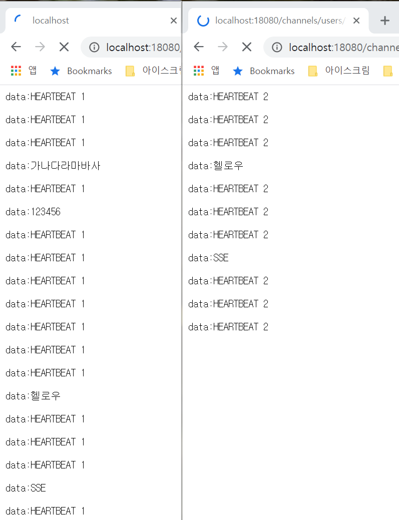 두 번째 브라우저에서 접속한 뒤에 다시 POST로 메시지를 몇 개 더 전송한다. 아래 그림과 같이 첫 번째 브라우저와 두 번째 브라우저가 동일 데이터를 수신한 것을 확인할 수 있다.