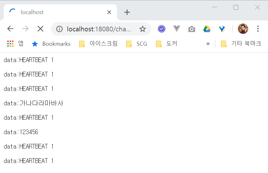 첫 번째 브라우저에서 http://localhost:18080/channels/users/1/messages 에 접속한다. 그리고 POST로 데이터를 두 개 전송한다. 그러면 첫 번째 브라우저에 POST로 전송한 두 문자열이 표시되는 것을 확인할 수 있다.